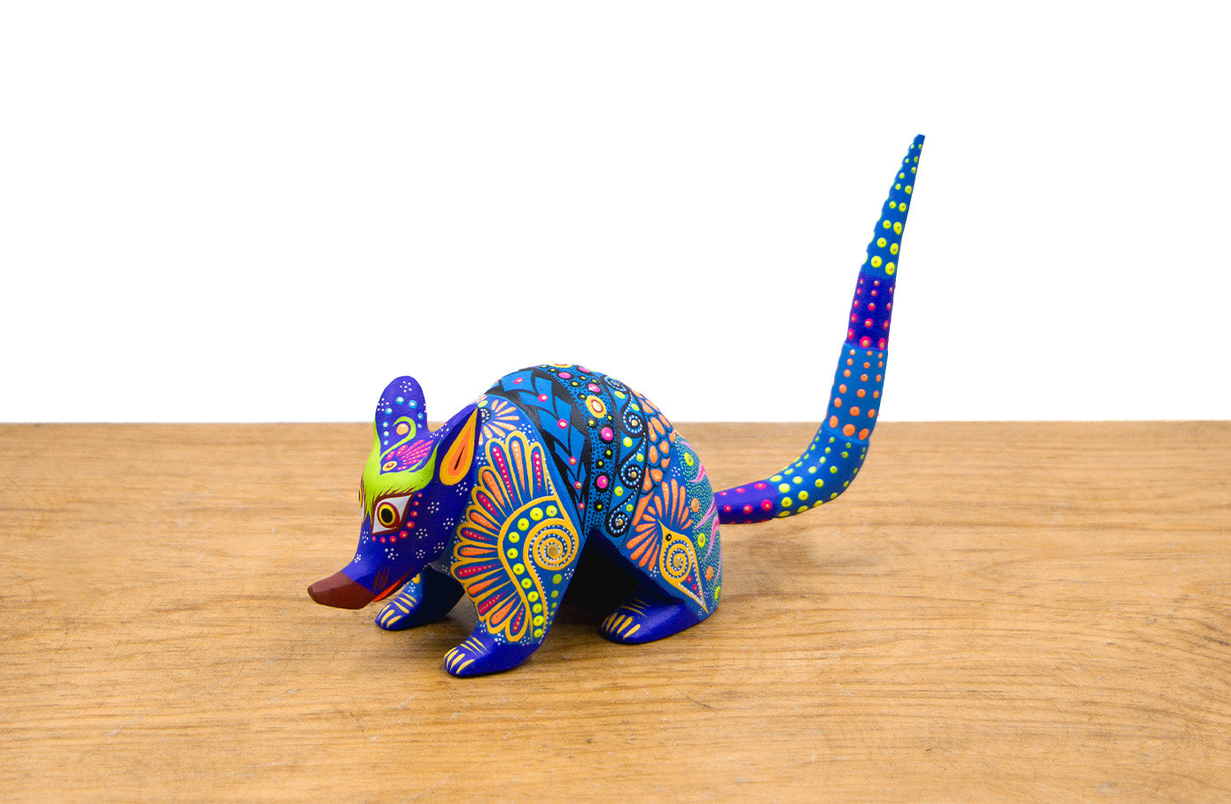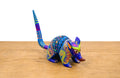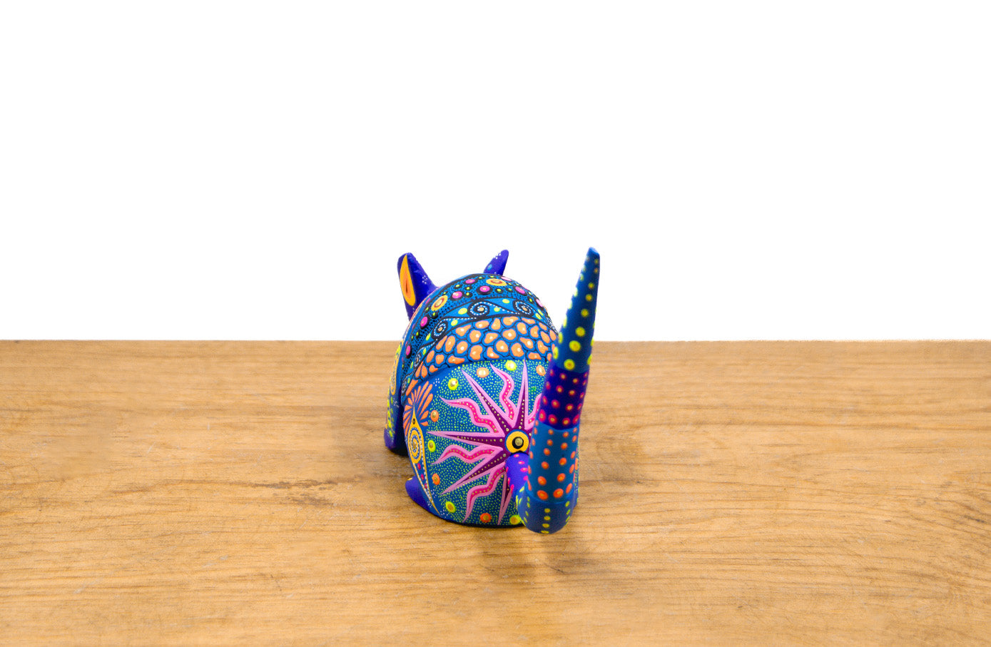Alebrije con forma de armadillo, tallado y pintado a mano por artesanos mexicanos del estado de Oaxaca.