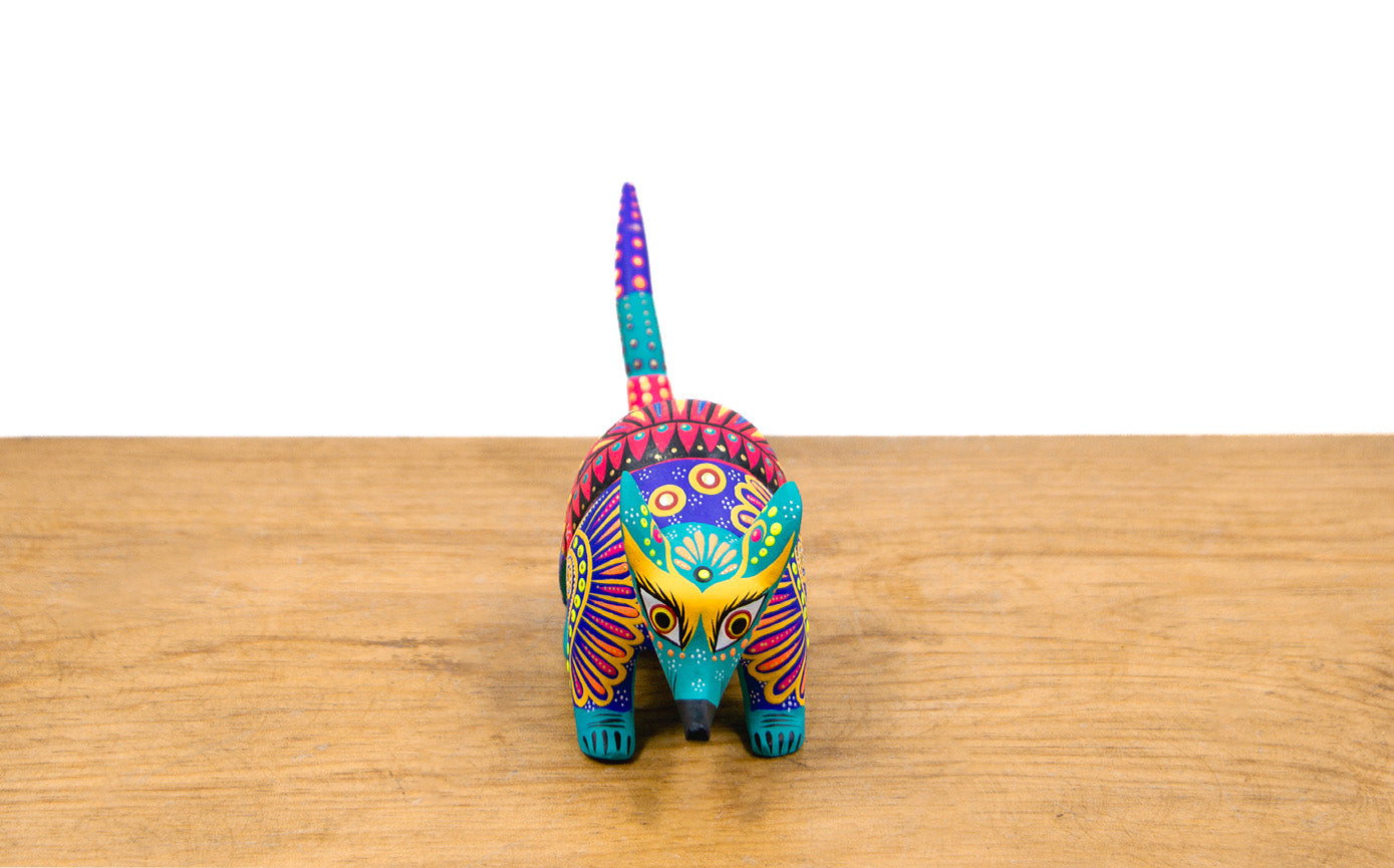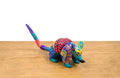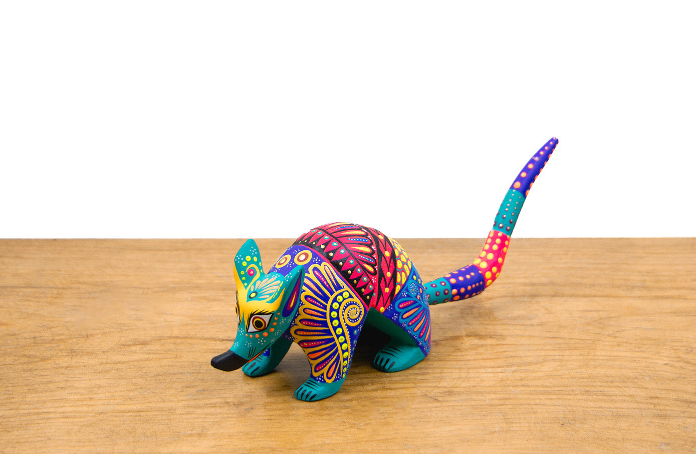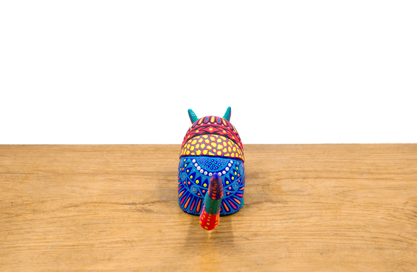Alebrije con forma de armadillo, tallado y pintado a mano por artesanos mexicanos del estado de Oaxaca.