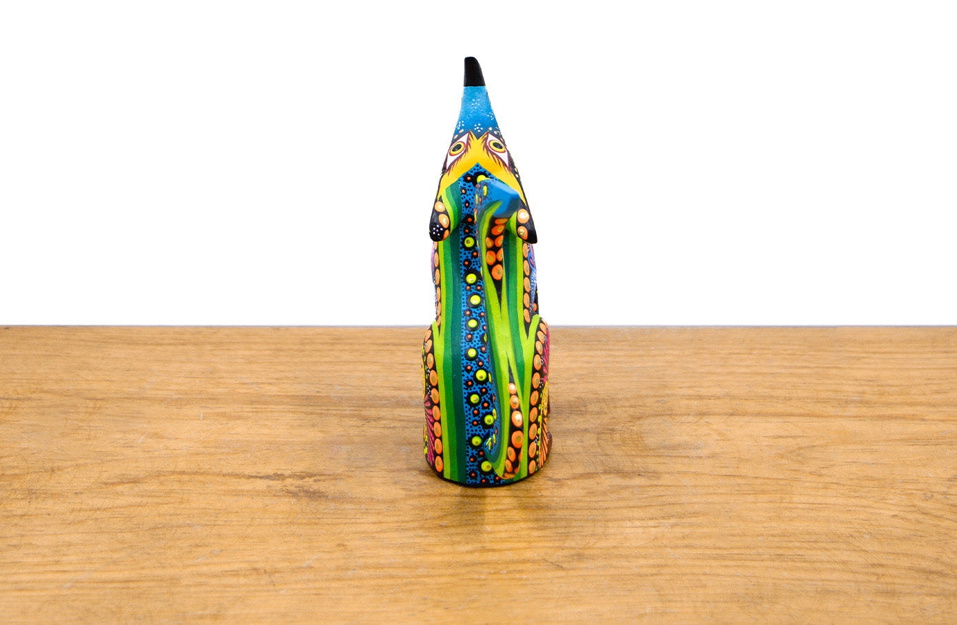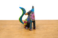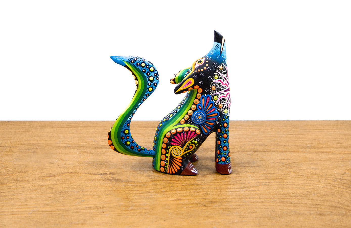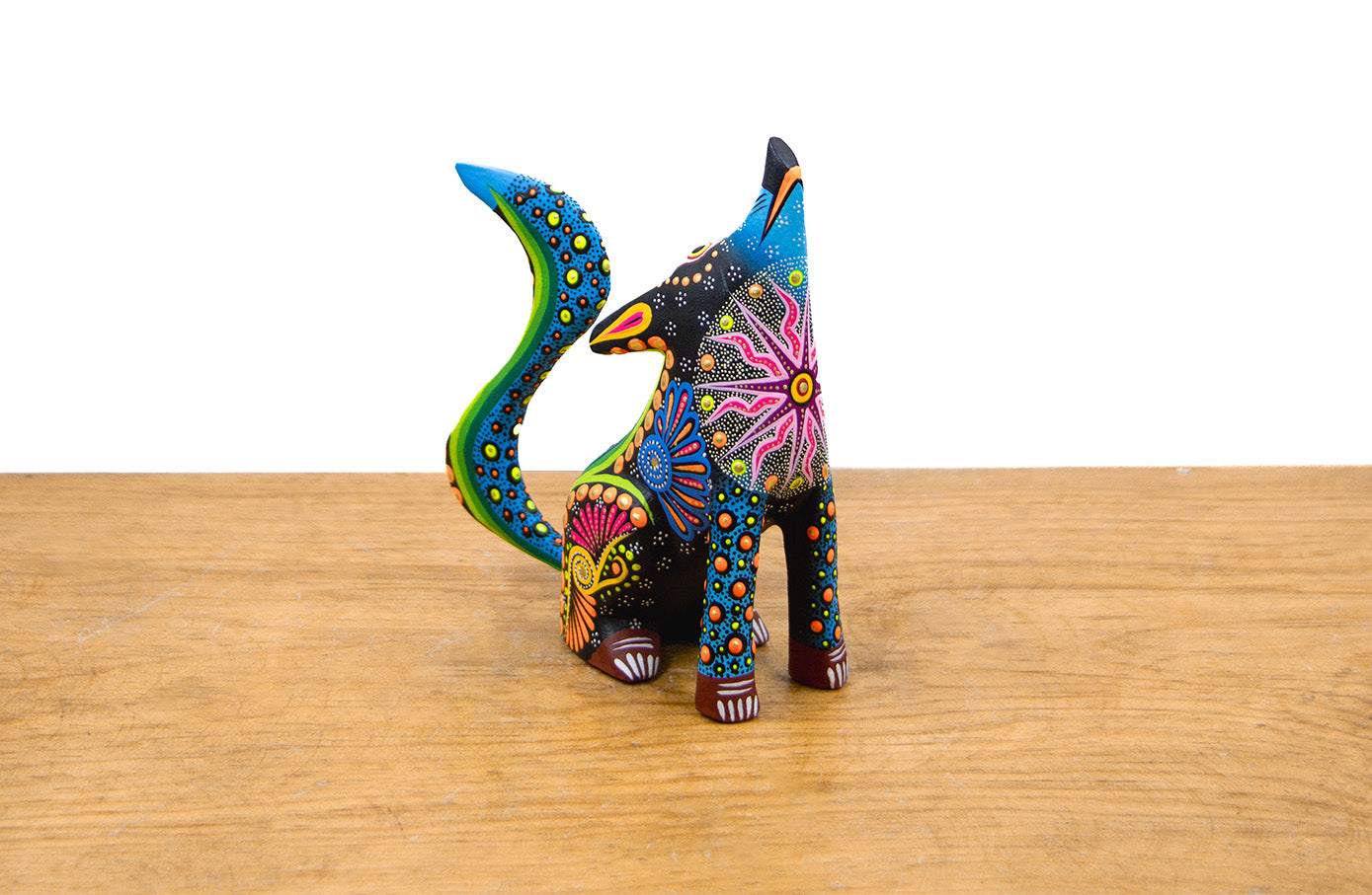 Alebrije con forma de coyote, tallado y pintado a mano por artesanos mexicanos del estado de Oaxaca.
