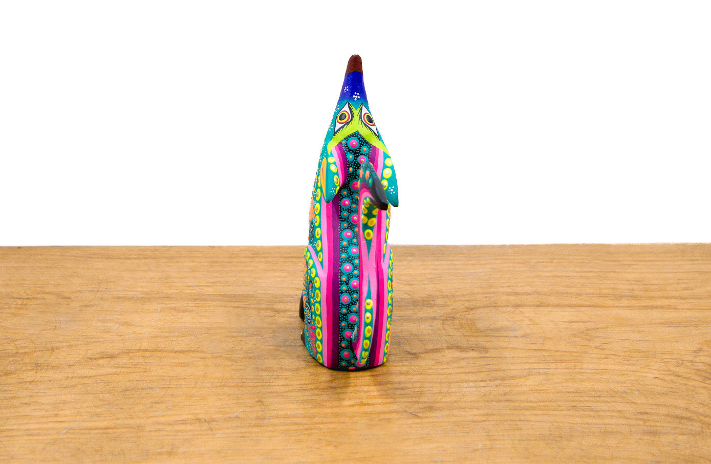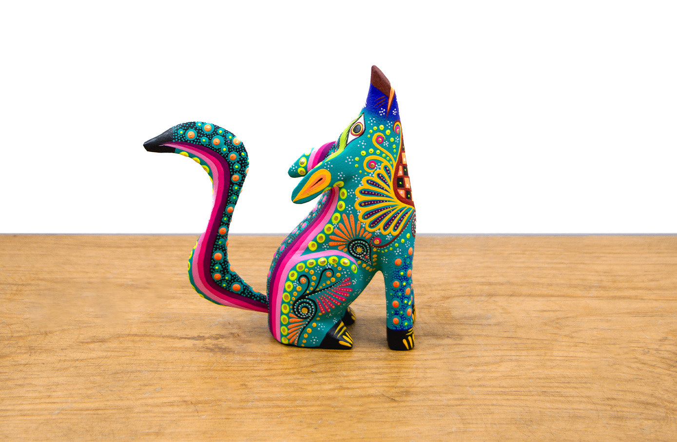 Alebrije con forma de coyote, tallado y pintado a mano por artesanos mexicanos del estado de Oaxaca.
