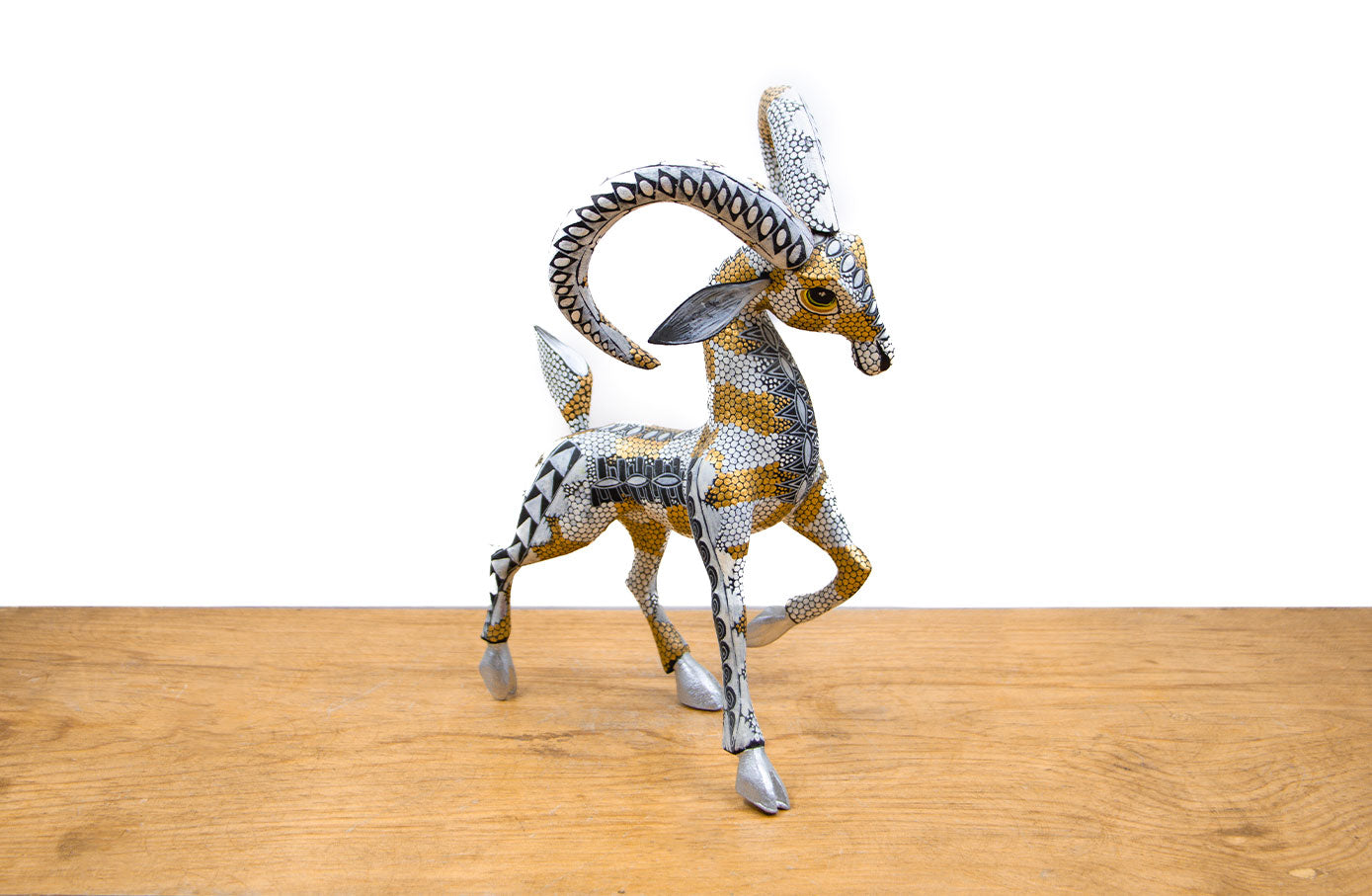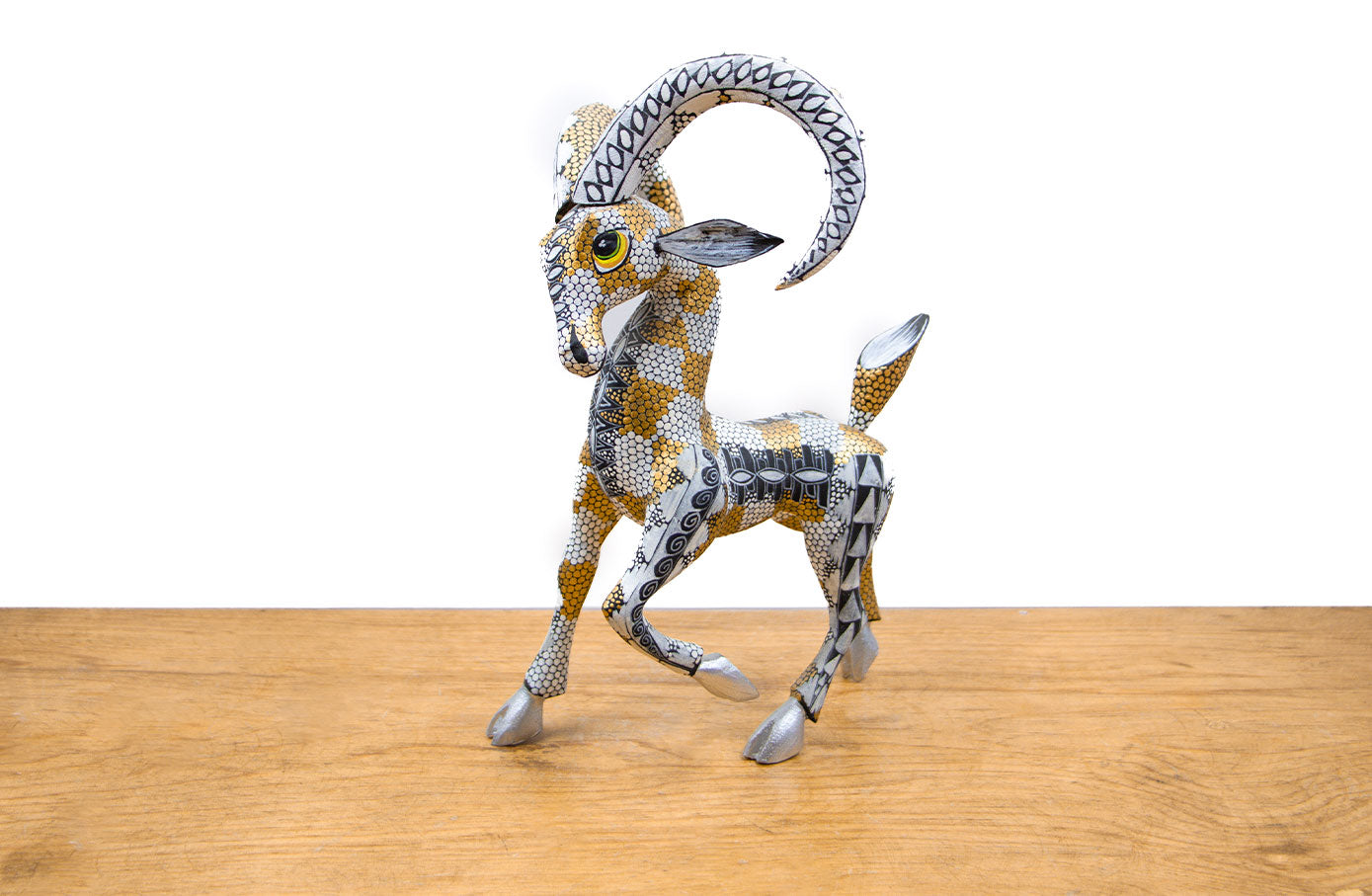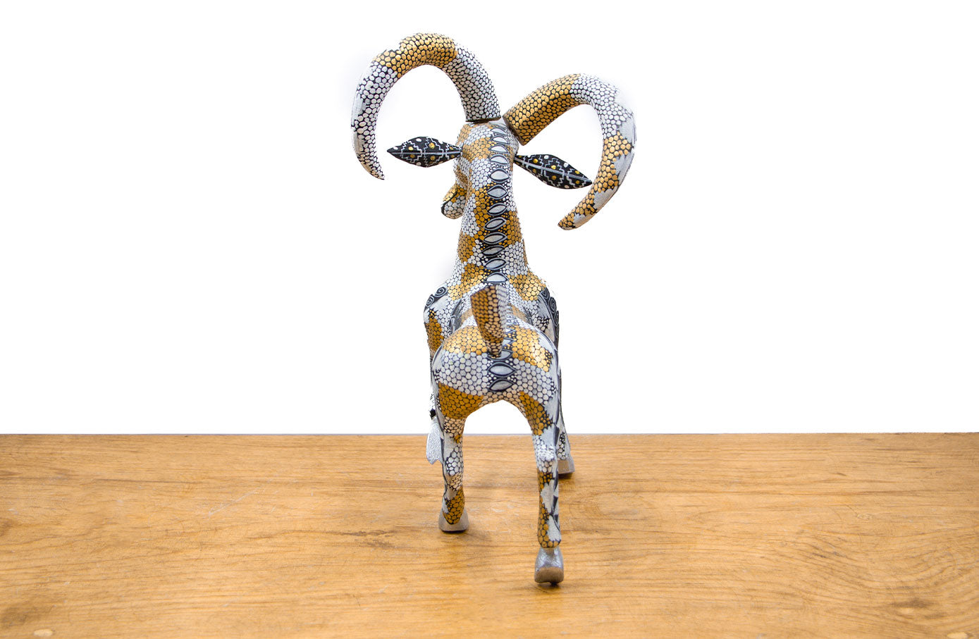 Alebrije con forma de carnero, tallado y pintado a mano por artesanos mexicanos del estado de Oaxaca.
