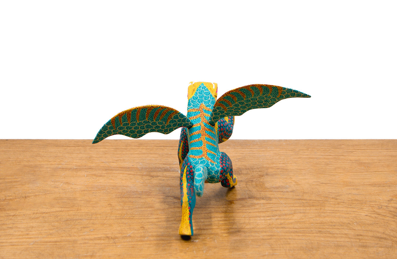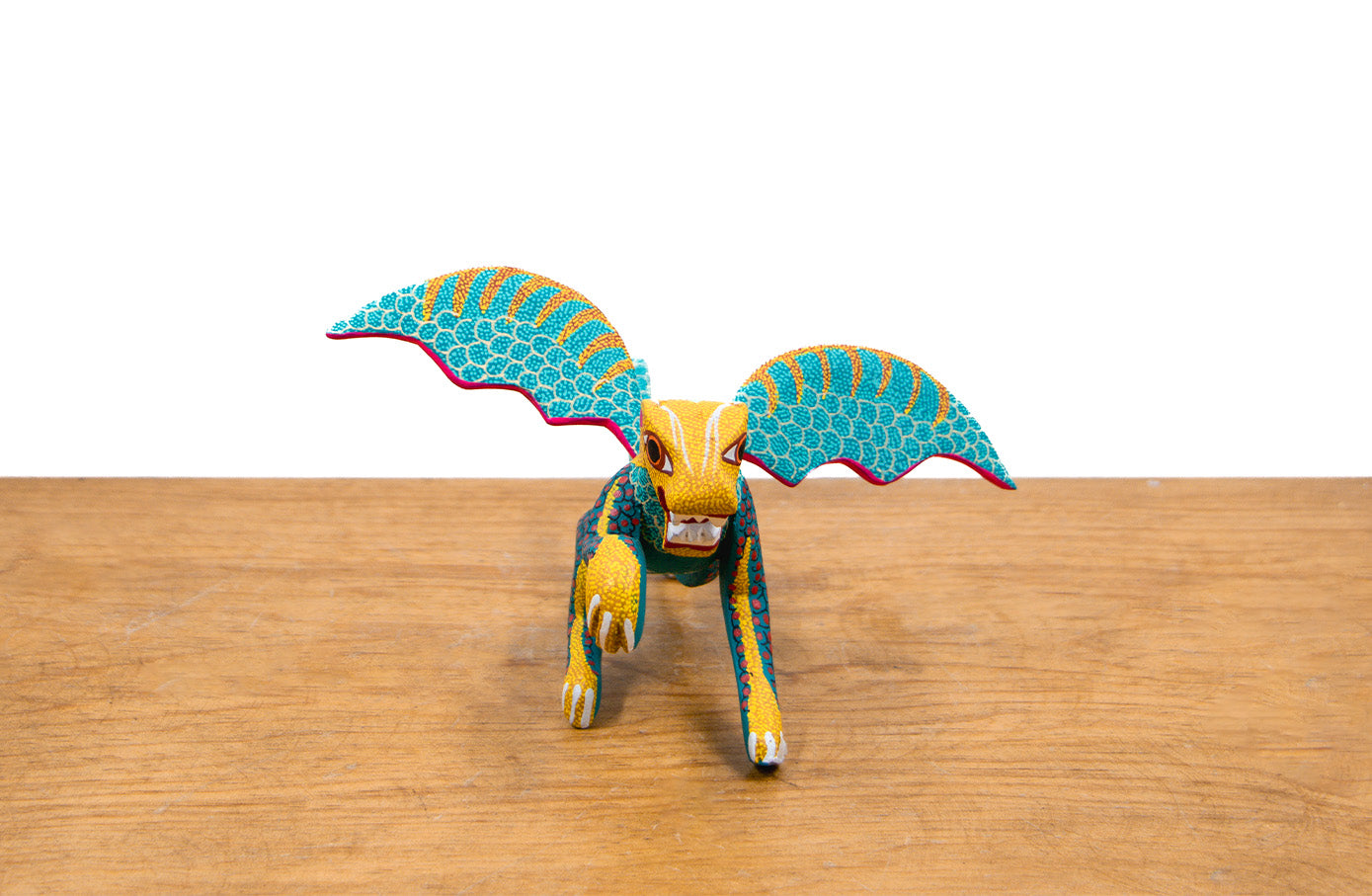 Alebrije con forma de jaguar, tallado y pintado a mano por artesanos mexicanos del estado de Oaxaca.