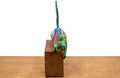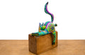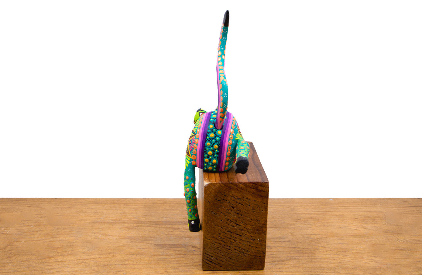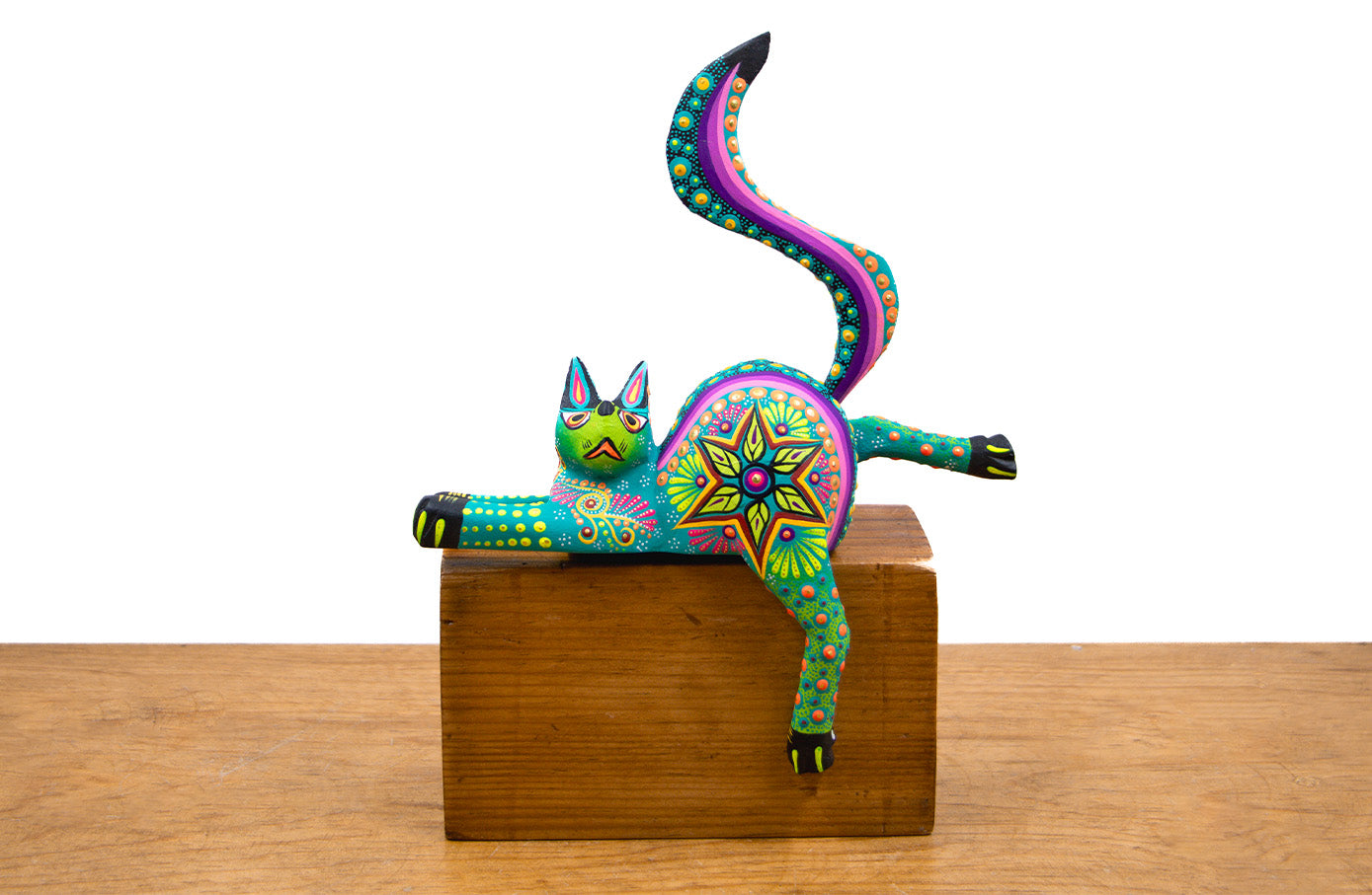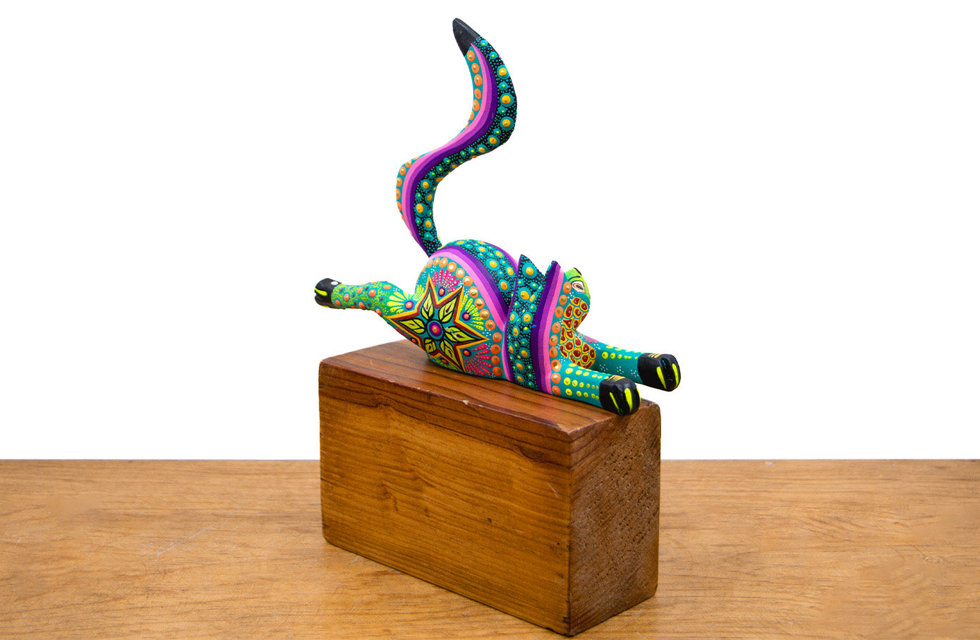 Alebrije con forma de gato, tallado y pintado a mano por artesanos mexicanos del estado de Oaxaca.