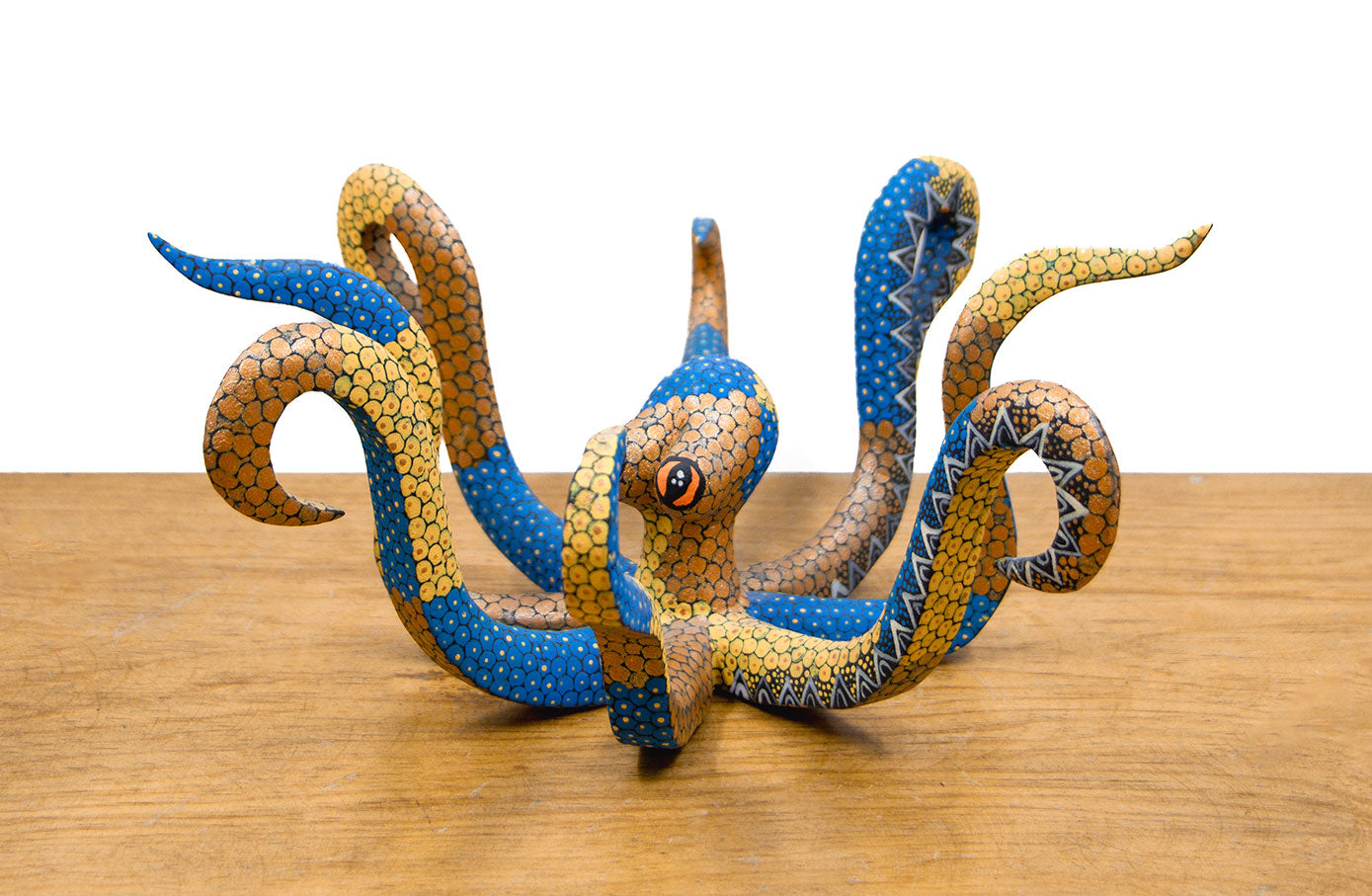 Alebrije con forma de pulpo, tallado y pintado a mano por artesanos mexicanos del estado de Oaxaca.
