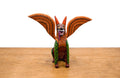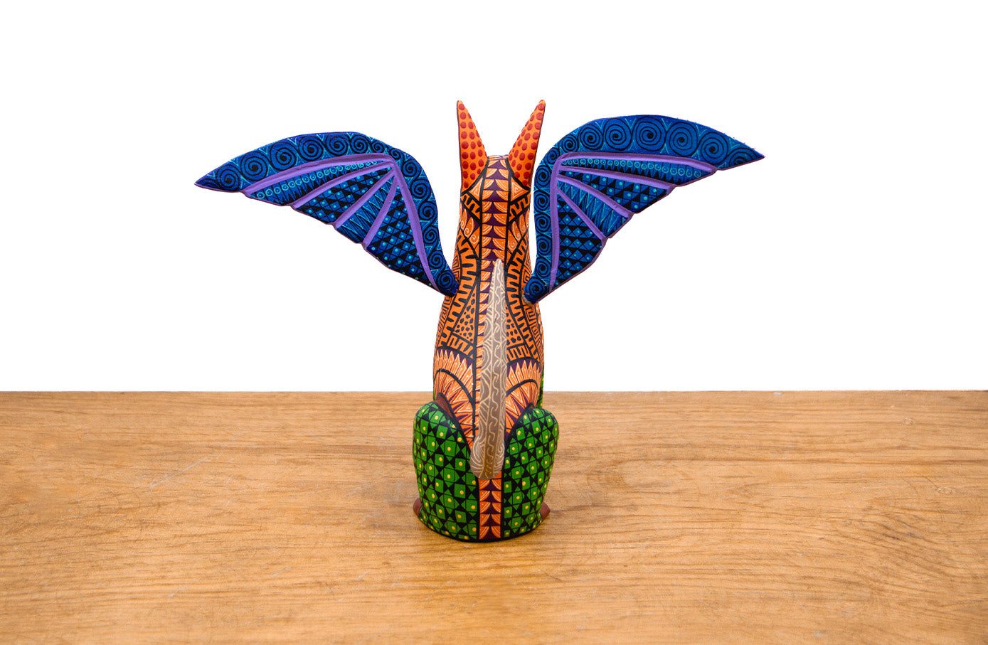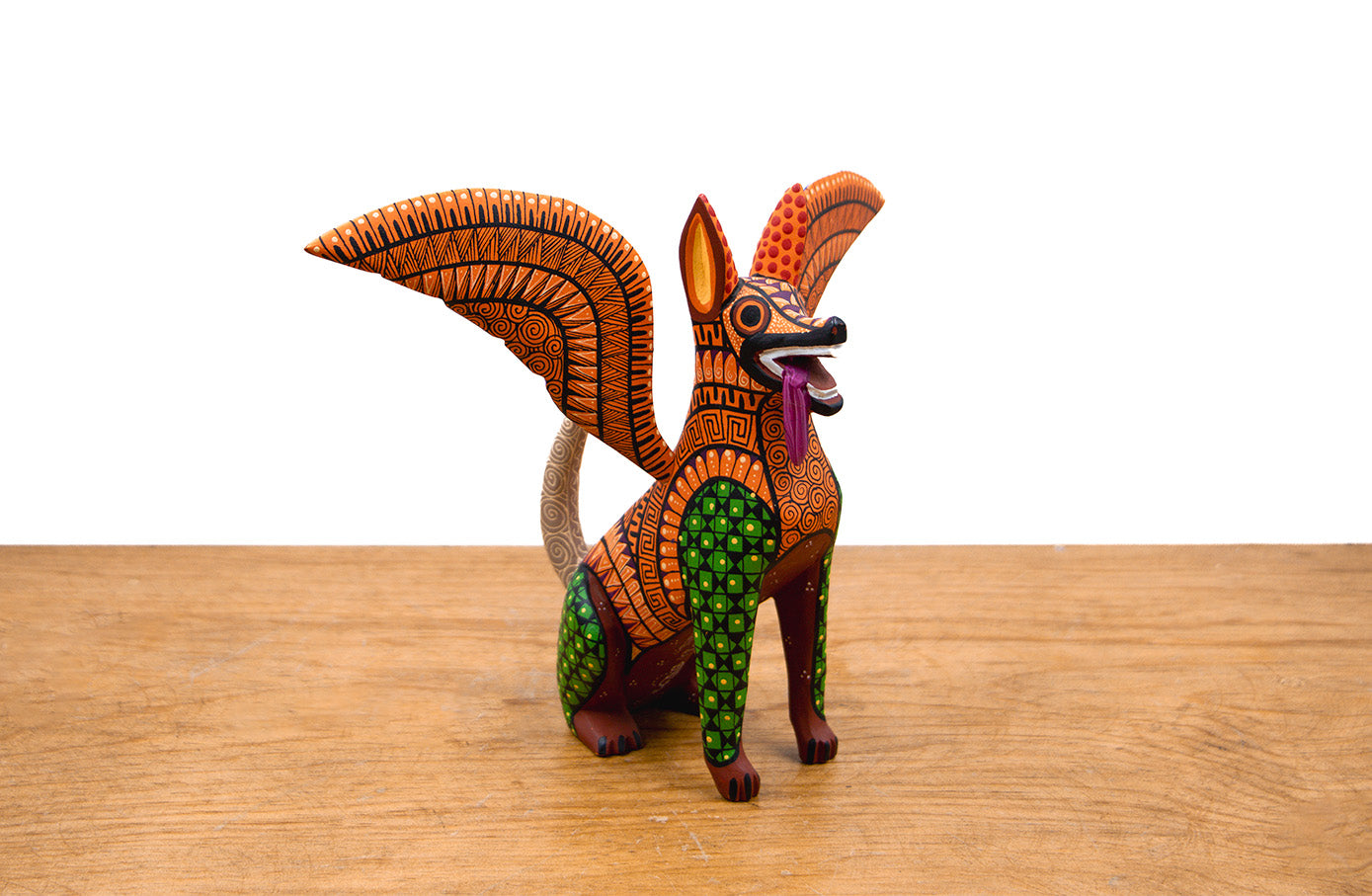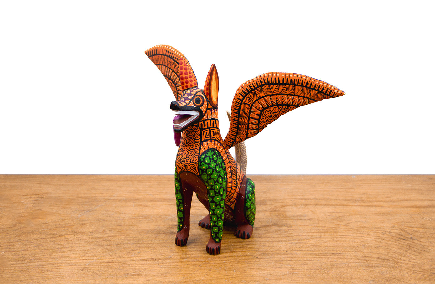 Alebrije con forma de xolo, tallado y pintado a mano por artesanos mexicanos del estado de Oaxaca.