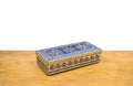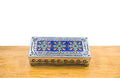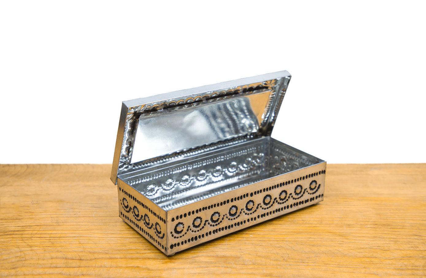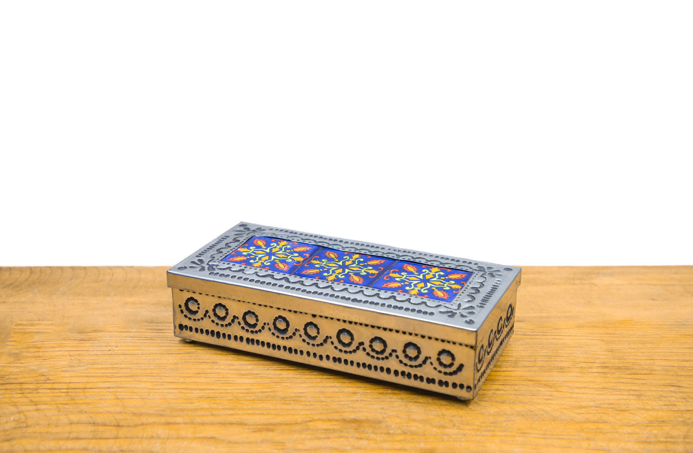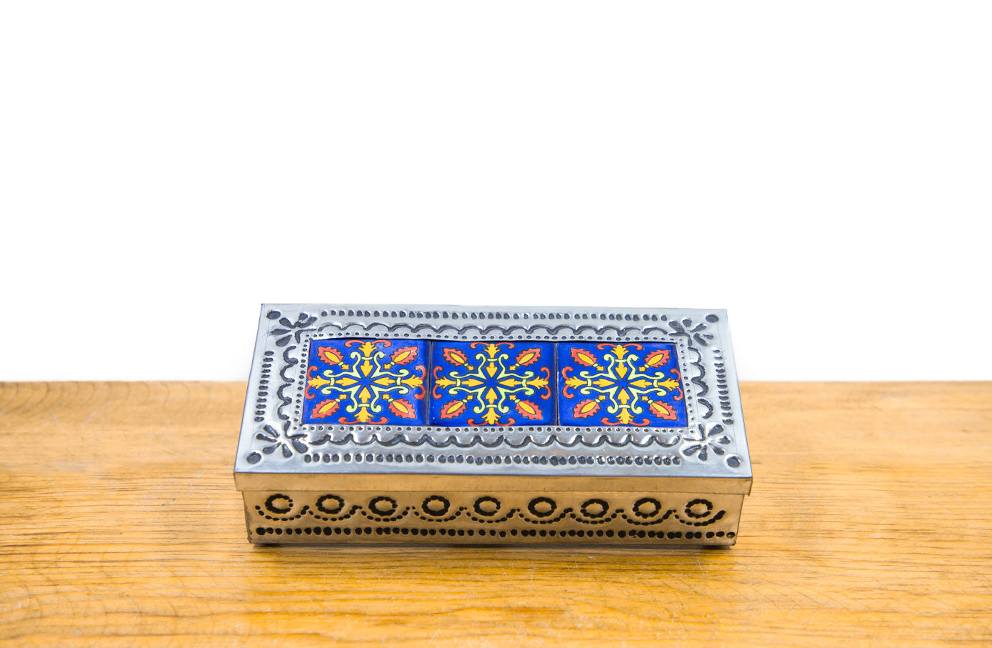 Hermoso alhajero de metal con mosaicos de talavera elaborado por artesanos de Guanajuato.