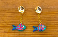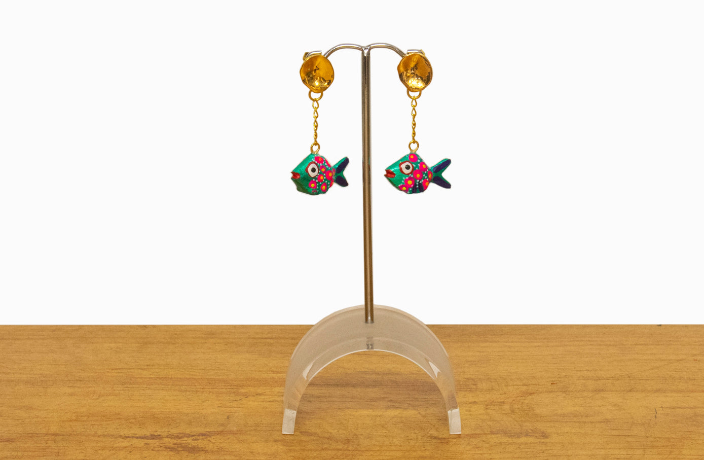 Coloridos aretes tipo alebrije, con forma de pescado. Hechos con madera por artesanos mexicanos en el estado de Oaxaca.