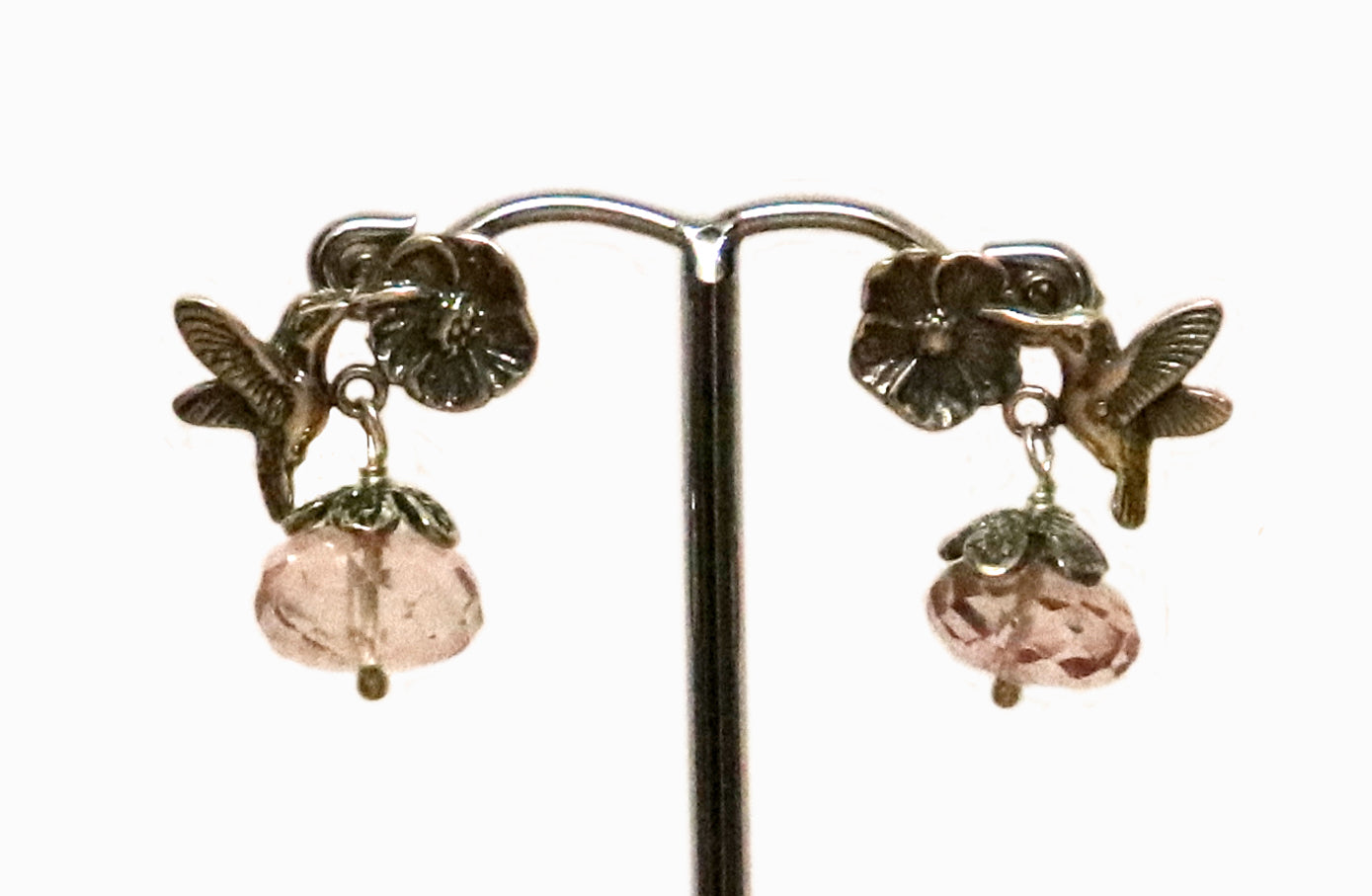 Hermosas aretes de plata con forma de colibrí posado en una flor, con piedra natural color rosa. Hechos por artesanos mexicanos en el estado de Jalisco.