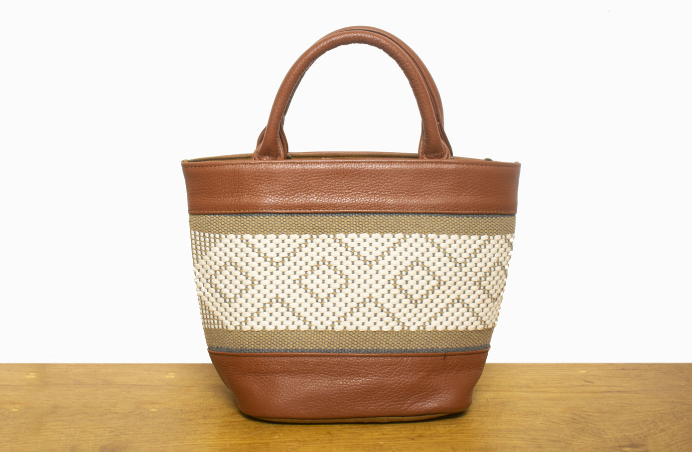 Hermosa bolsa de piel con panel de algodón tejido en telar de cintura. Hecha a mano por artesanos mexicanos en el estado de Oaxaca.