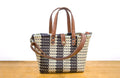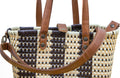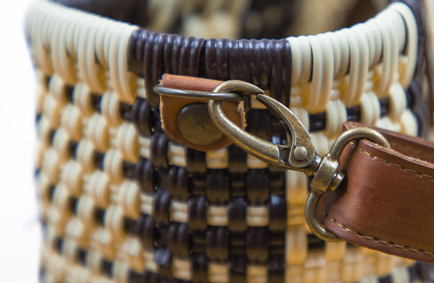 Hermosa bolsa para niña tejida con fibra plástica y asa de piel elaborada por artesanos mexicanos de Jalisco.