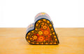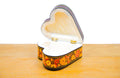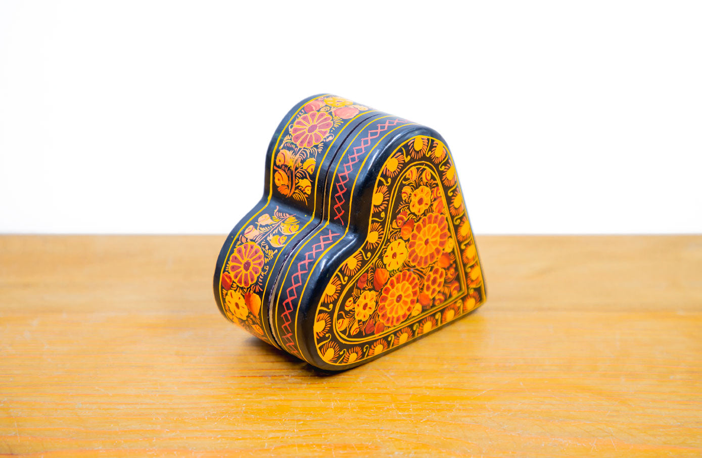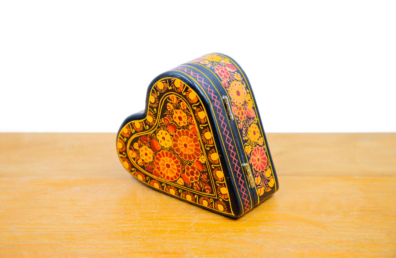Caja de madera en forma de corazón laqueada con técnica olinalá pintada con óleos naturales, hecha por manos de artesanos del estado de Guerrero.