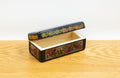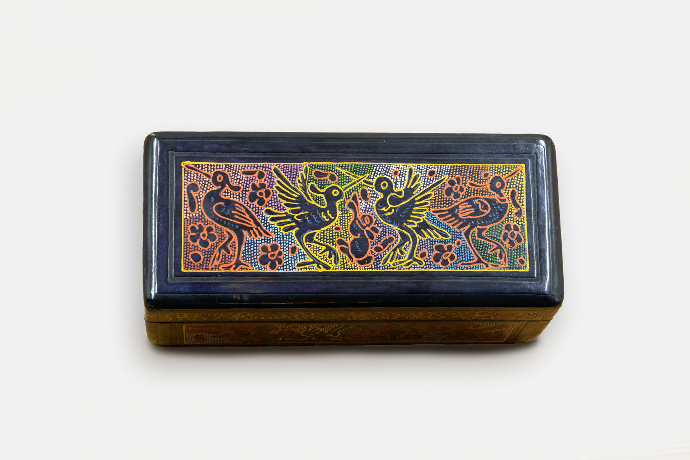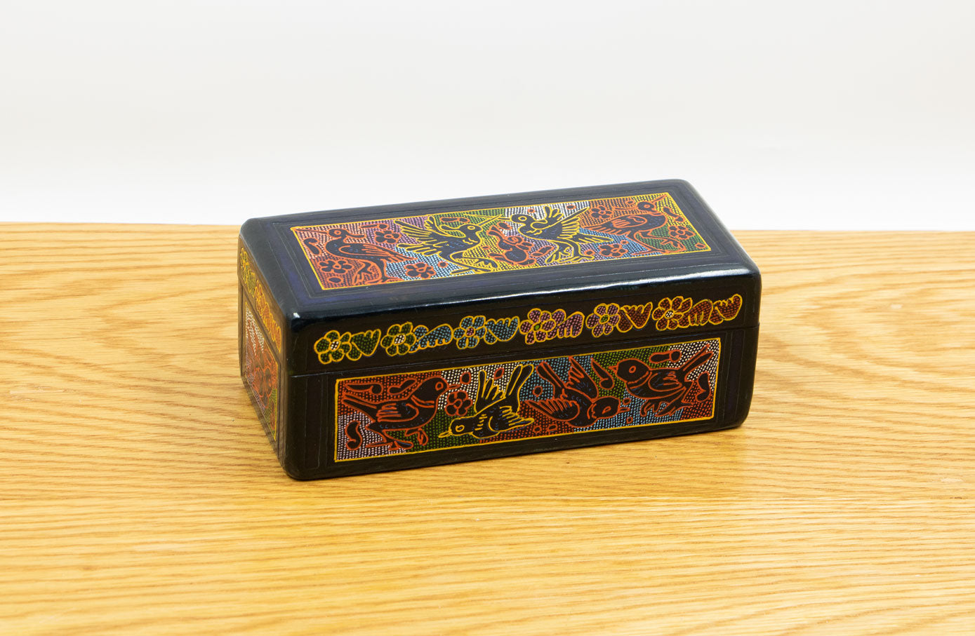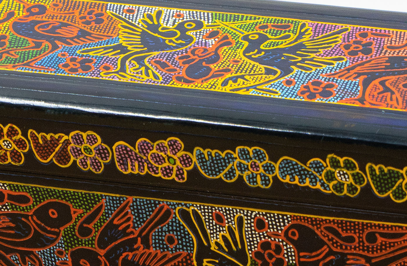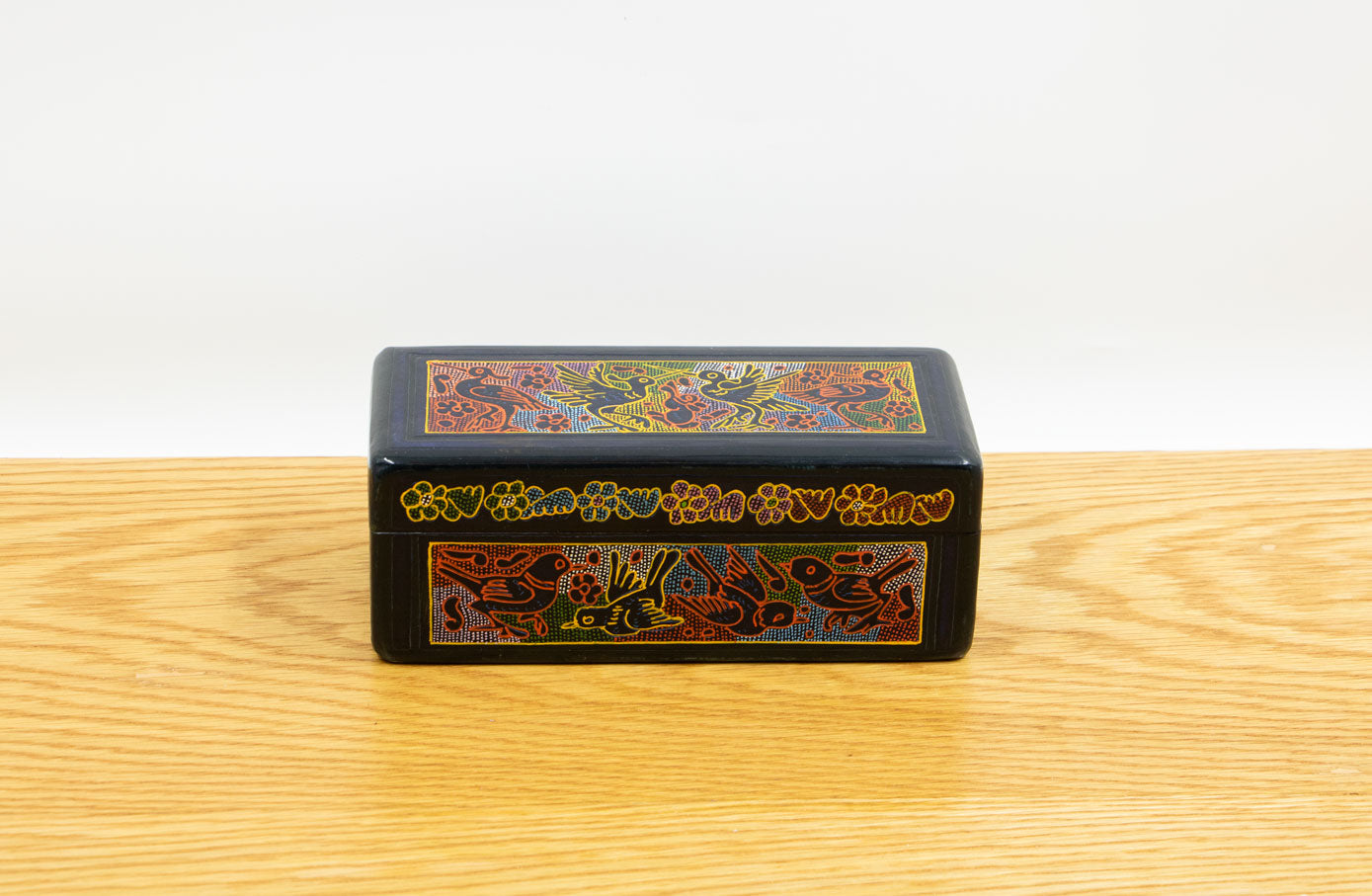 Caja esclavera rayada punteada negra con amarillo y naranja hecha en Guerrero.