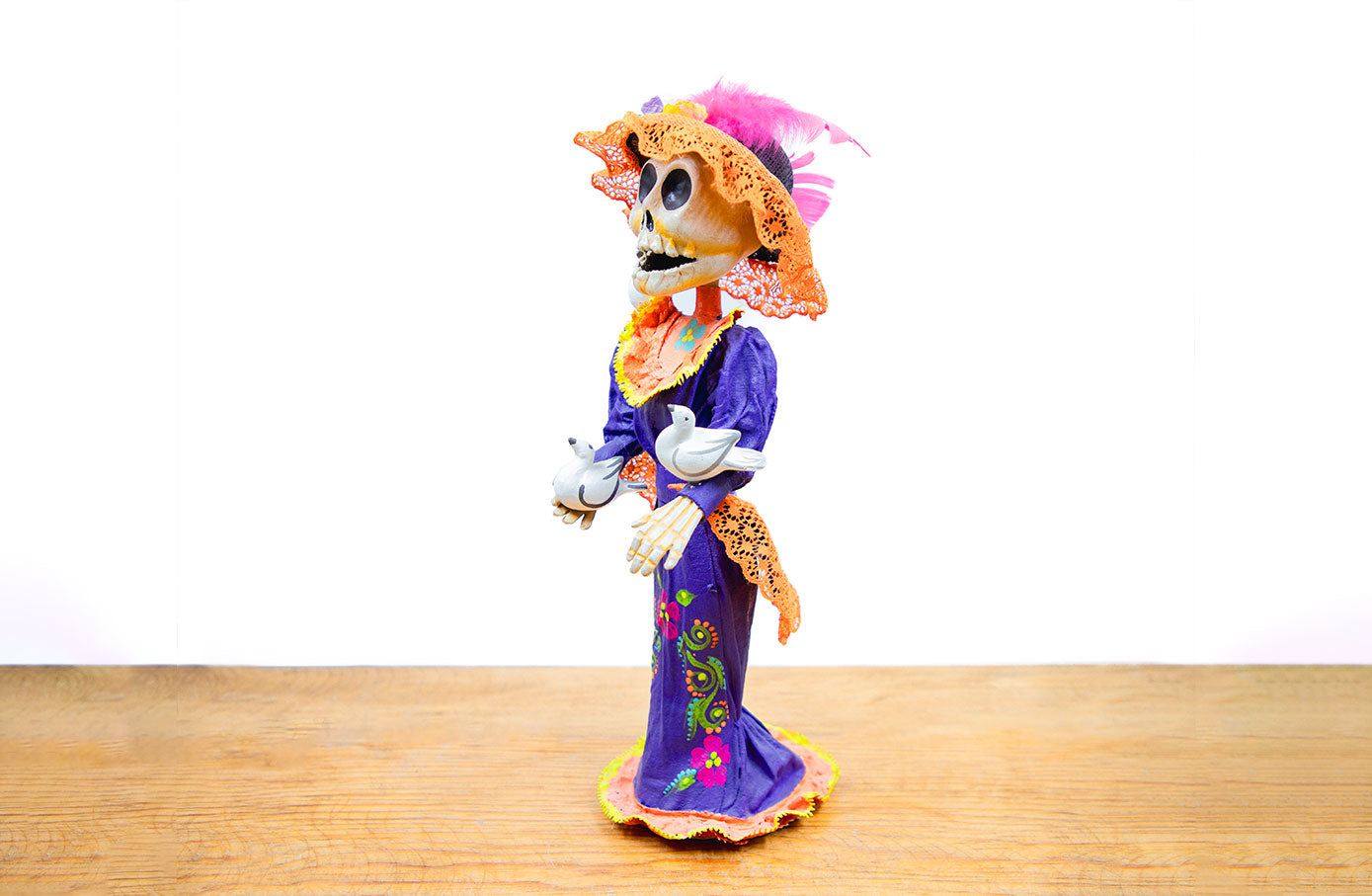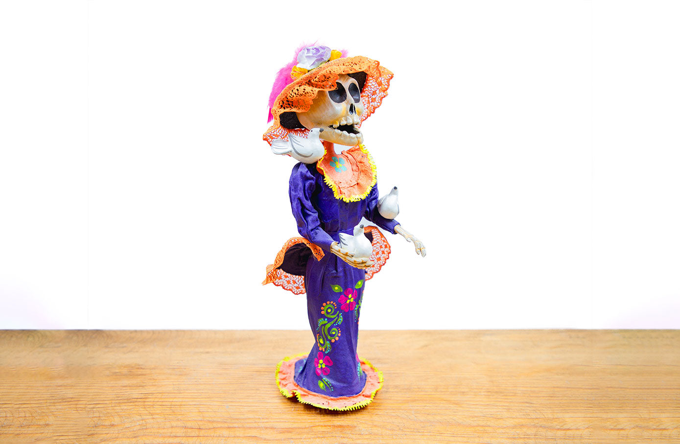 Figura de "Catrina palomas mini" hecha de papel maché elaborada por talentosos artesanos mexicanos del estado de Guanajuato.