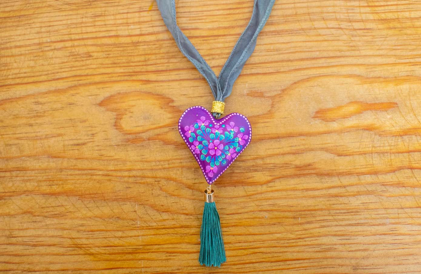Hermoso collar con corazón de madera decorado, con pompón y tira tipo seda. Hecho a mano por artesanos mexicanos en el estado de Oaxaca.