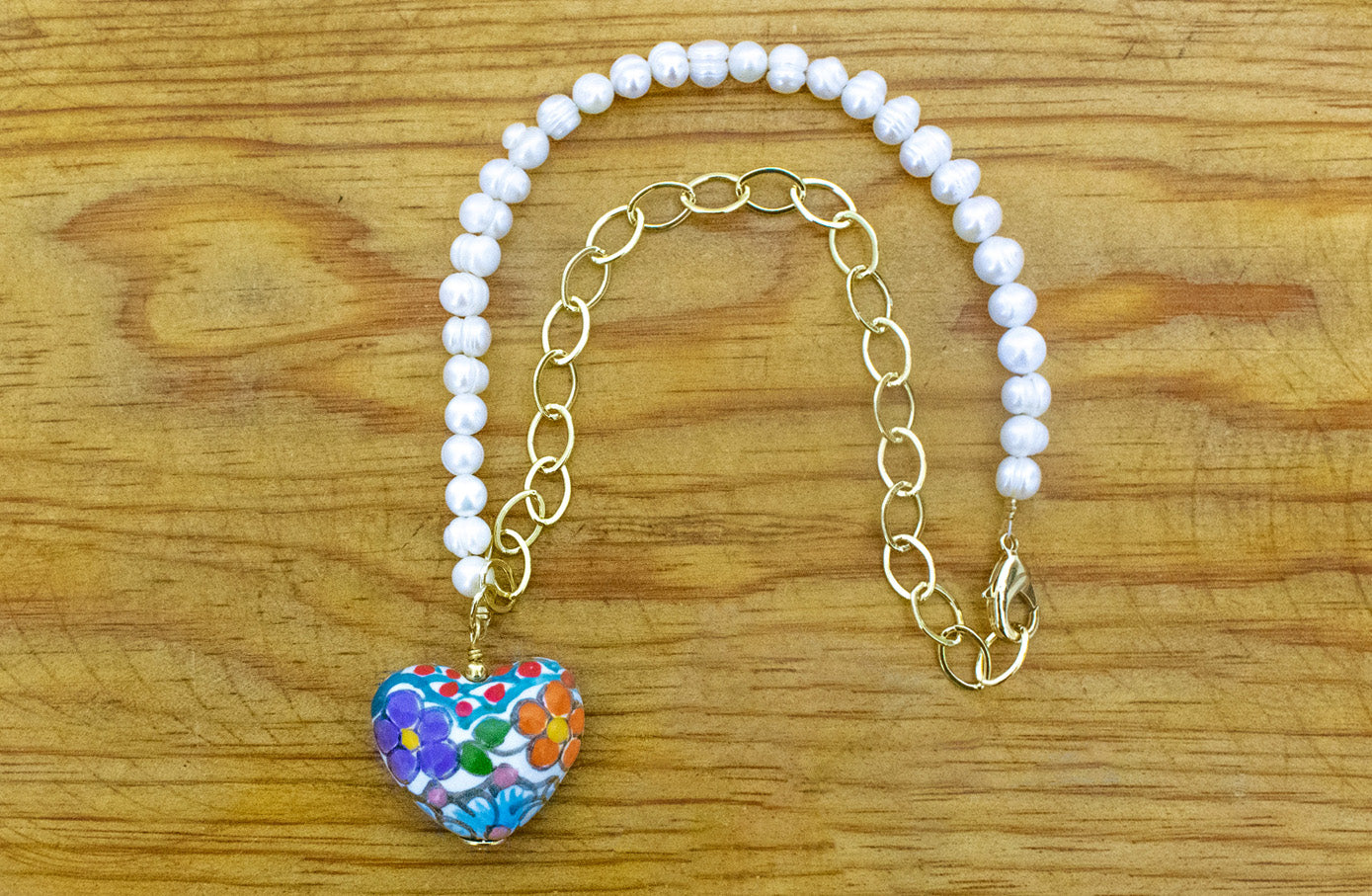 Hermoso collar de acero dorado con perlas y un corazón de cerámica tipo Talavera.