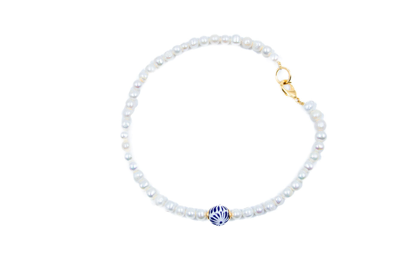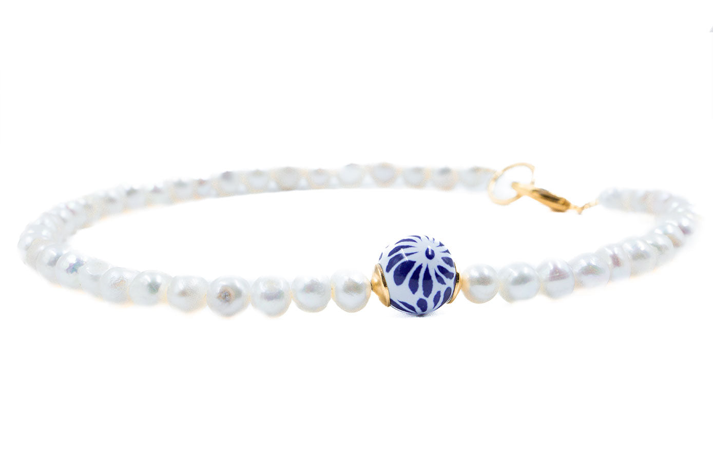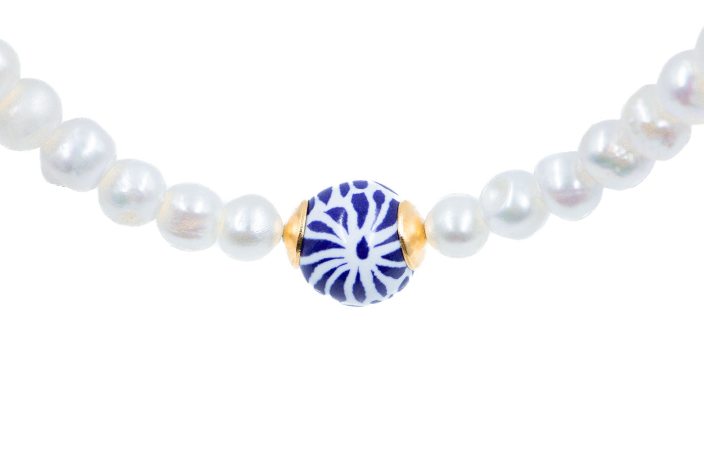 Collar de perlas y talavera "Ainhoa" hecho de perlas y acero inoxidable, elaborado por artesanos de Jalisco.