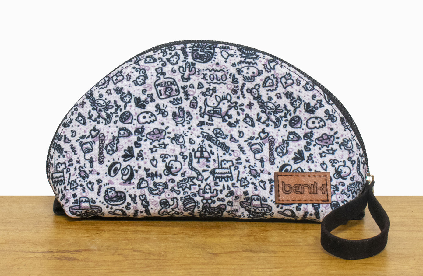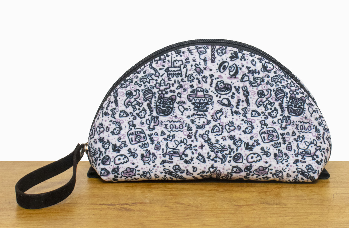 Moderna cosmetiquera de tela resistente, con estampado de garabatos en color negro. Hecha de forma artesanal por artistas mexicanos en el estado de Guanajuato.