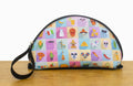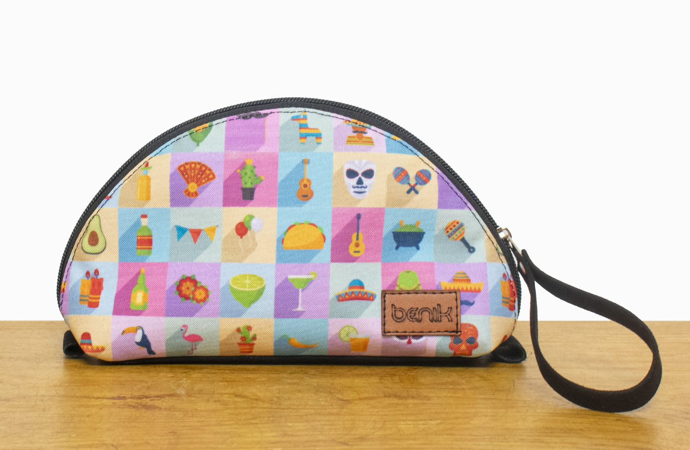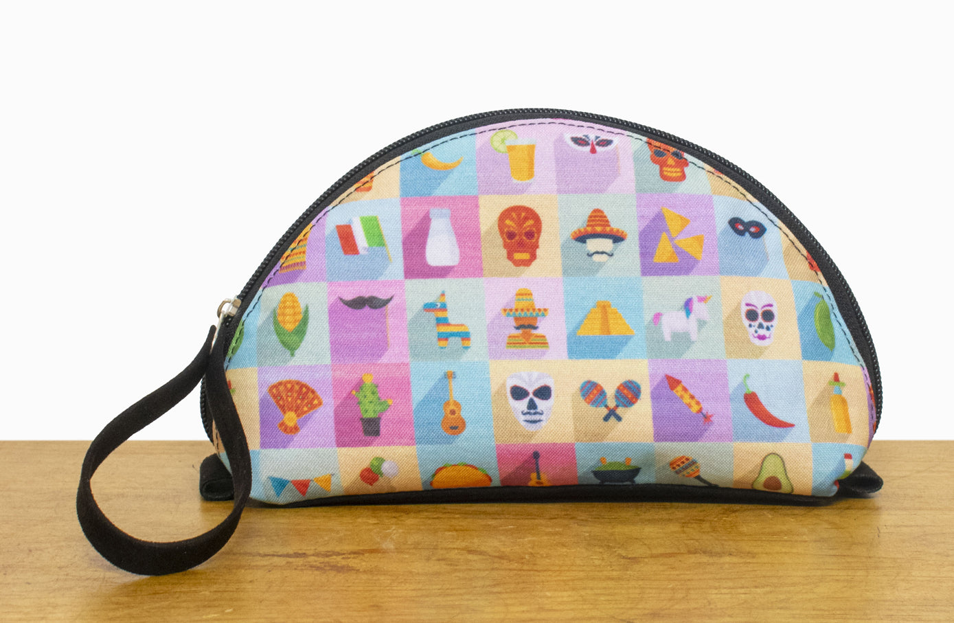Moderna cosmetiquera de tela resistente, con estampado tipo lotería en colores pastel. Hecha de forma artesanal por artistas mexicanos en el estado de Guanajuato.