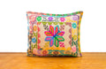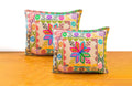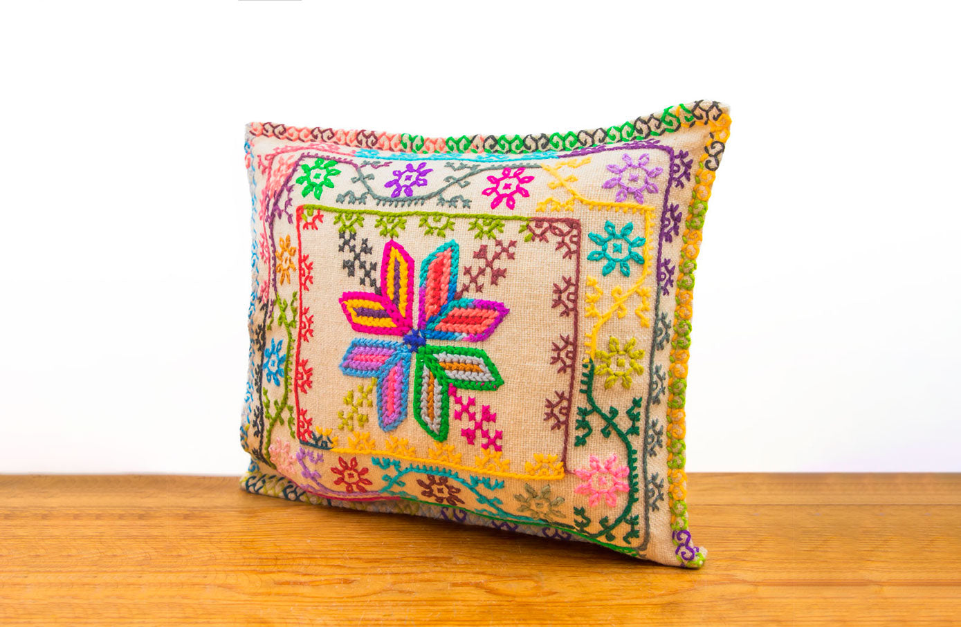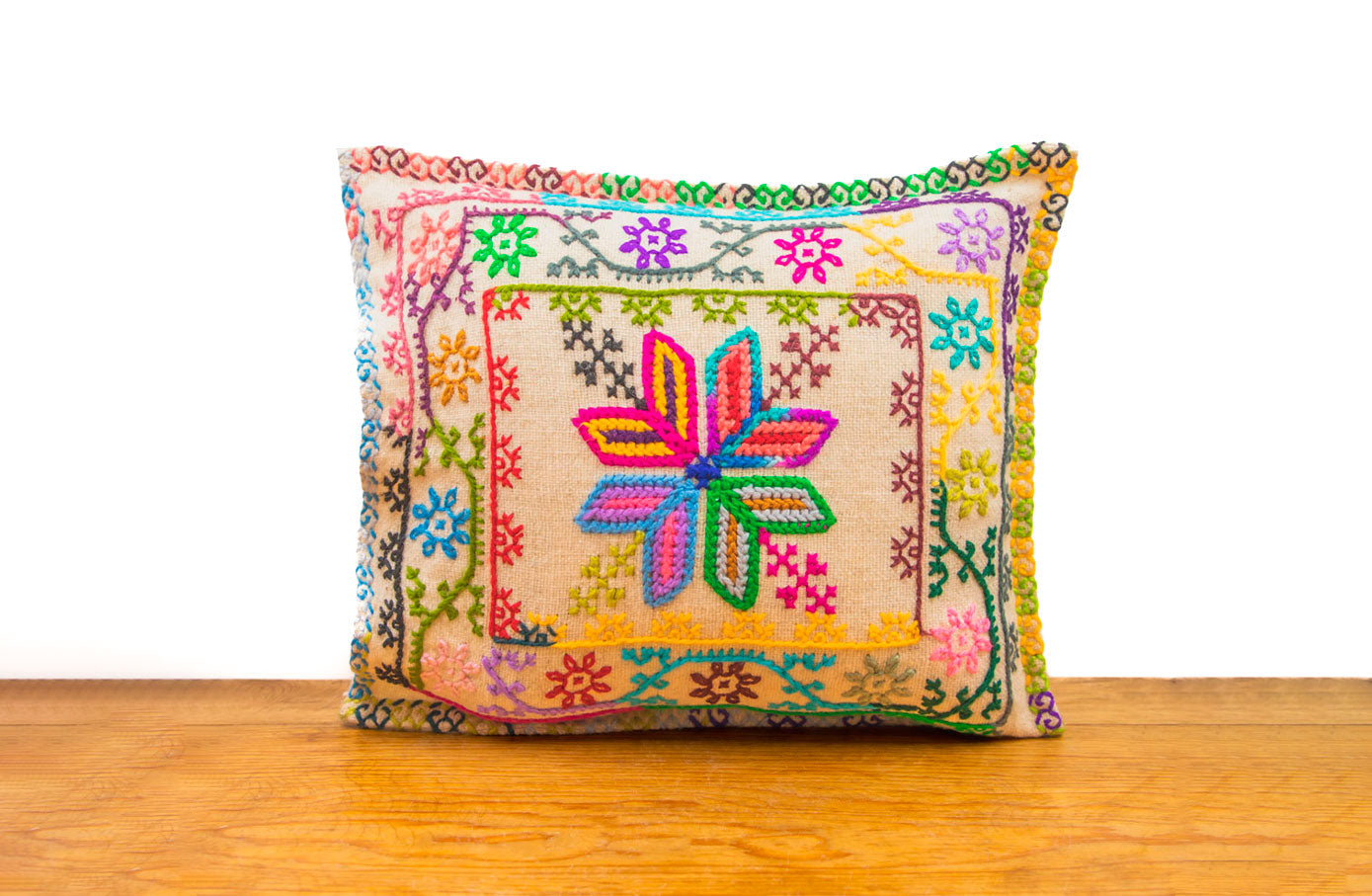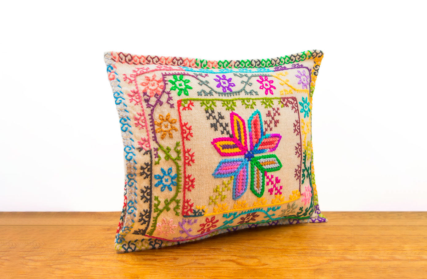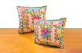 Juego de 2 coloridas fundas para cojín decorativo, hechas de lana y bordadas por artesanos del Estado de México.
