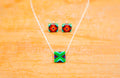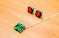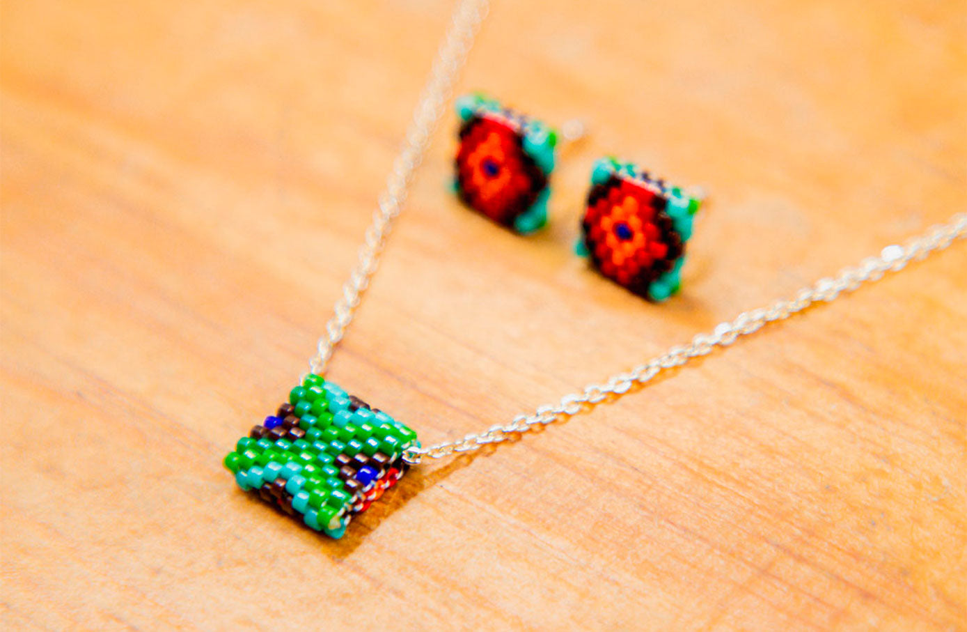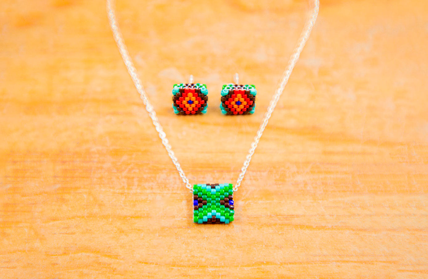 Juego de aretes y collar "Fuego" hechos de chaquira y plata, elaborado por artistas mexicanos del estado de Jalisco.