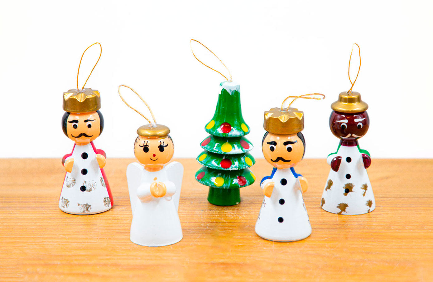 Juego de figuras navideñas hechas de madera, elaborado por artistas mexicanos del estado de Toluca.