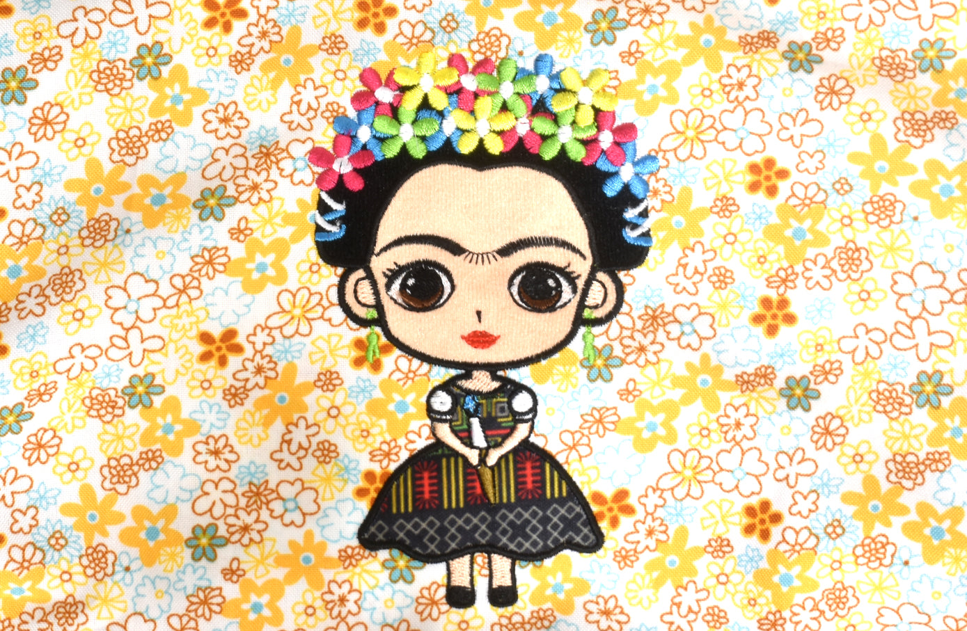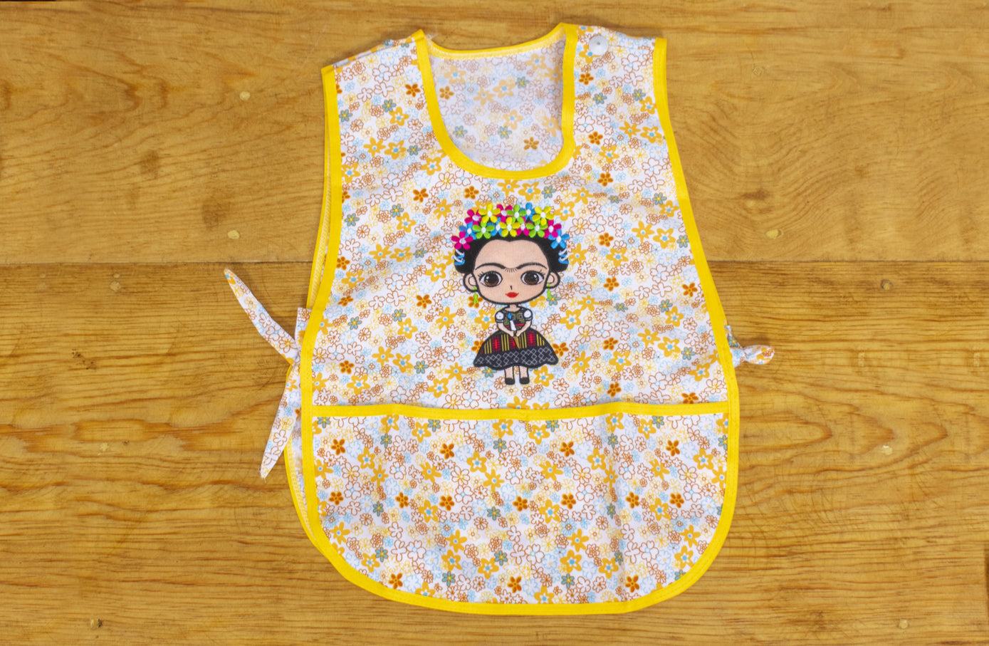 Hermoso mandil con tela de flores y figura de pequeña "Frida". Hecho artesanalmente por artistas mexicanos en el estado de Jalisco.