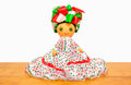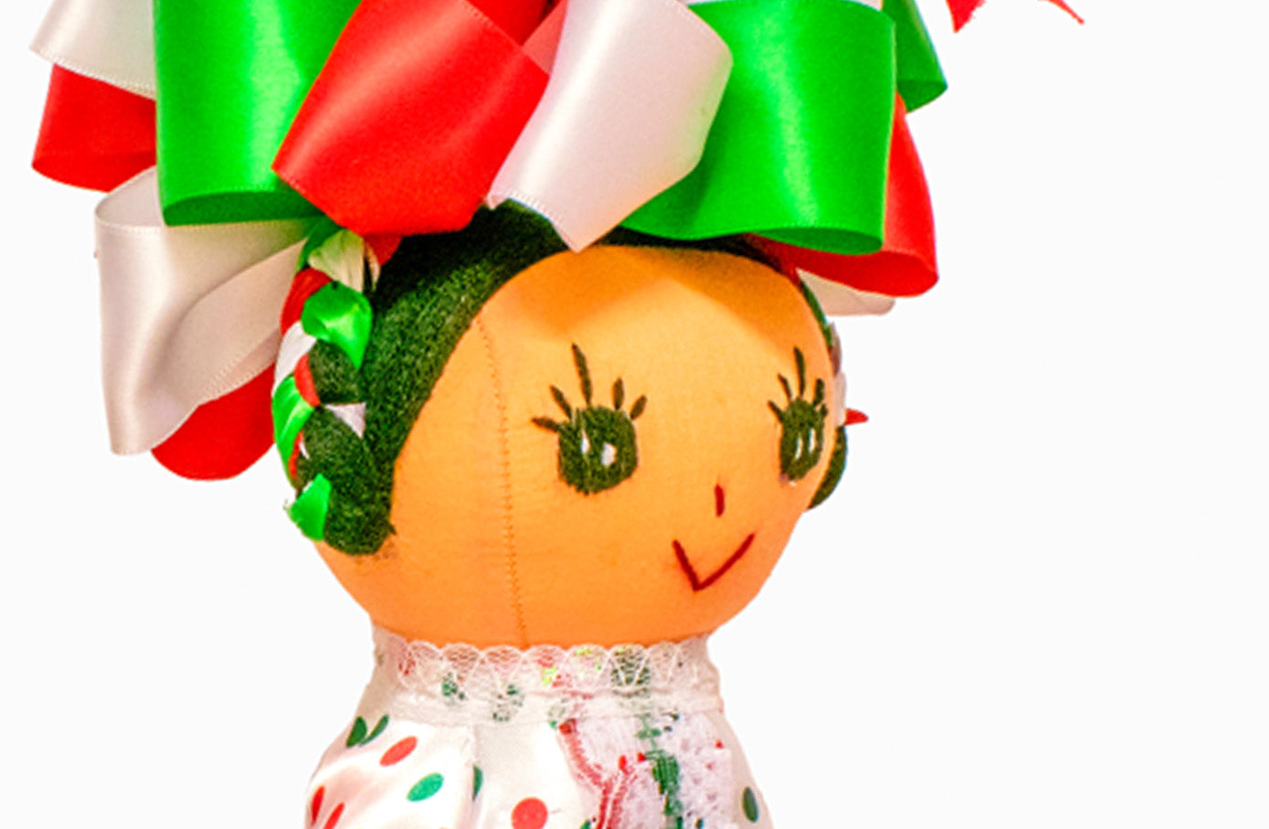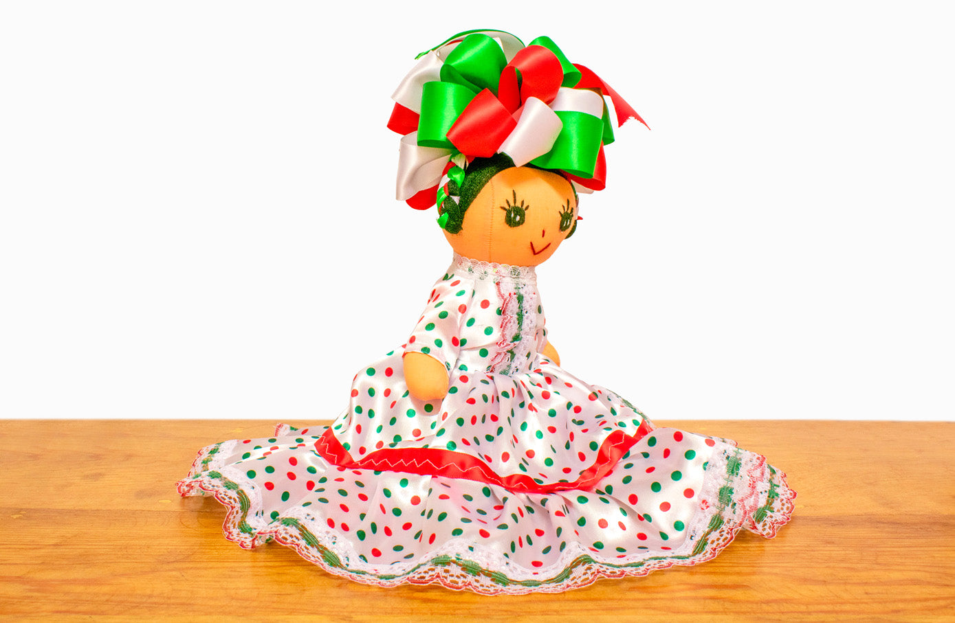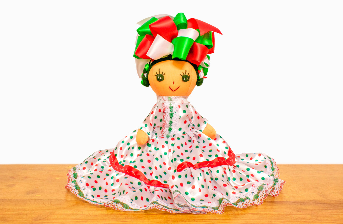 Hermosa muñeca de tela, con vestido y trenza tricolor, hecha por artesanos mexicanos en el estado de Queretaro. Tiene los ojos y la boca bordados y lleva tul bajo su vestido.