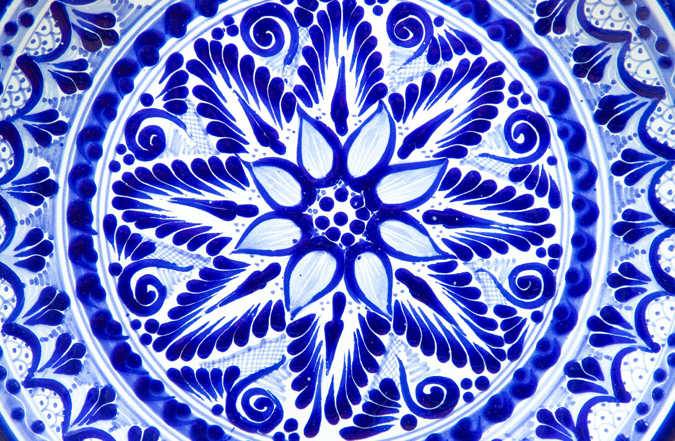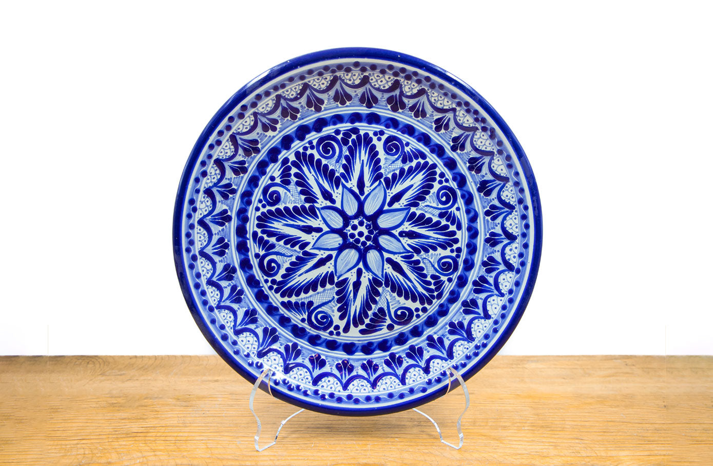 Plato decorativo de barro con diseño de talavera, hecho por manos de talentosos artesanos del estado de Puebla.