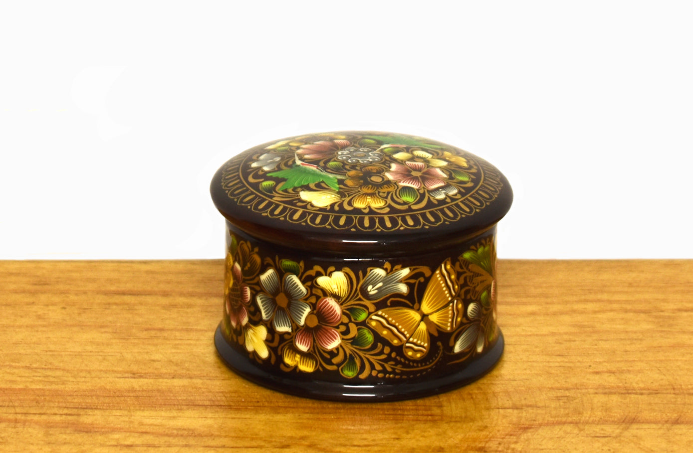 Hermosa polvera mediana, ideal para guardar pequeñas piezas de joyería. Hecha artesanalmente con madera laqueada en el estado de Michoacán.