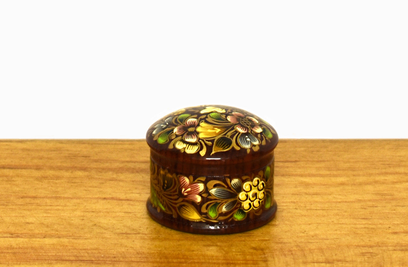 Hermosa polvera mini que funciona como pastillero. Hecha artesanalmente con madera laqueada en el estado de Michoacán.