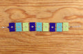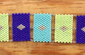 Colorida pulsera de chaquira de vidrio con rectángulos de colores unidos con plata. Hecha por artesanos mexicanos en el estado de Jalisco.