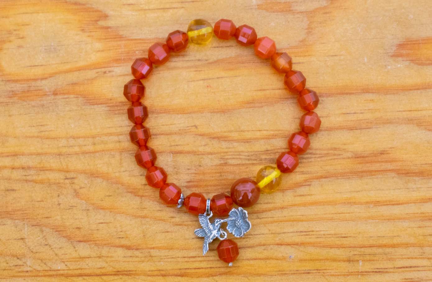 Hermosa pulsera de piedras naturales con colibrí hecho en plata 925. Con elástico. Hecha a mano por artesanos mexicanos en el estado de Jalisco.